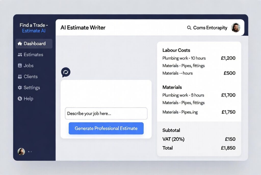 At Find a Trade, we’ve built a clean, modern AI Estimate Writer dashboard specifically for UK tradesmen. Here’s everything you need to know about how it works and why it’s a game-changer.